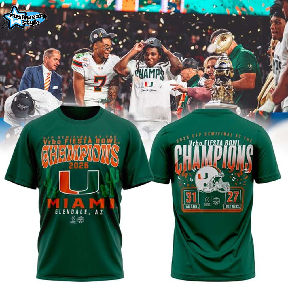 Celebrate the Miami Hurricanes’ thrilling journey to victory with the Men’s Green Miami Hurricanes College Football Playoff 2026 Fiesta Bowl Champions Scoring Drive T-Shirt. This must-have apparel features a stylish design that commemorates the championship moment, making it perfect for fans and collectors alike. Made from high-quality materials, this tee ensures comfort while showcasing your team spirit. Grab your Men’s Green Miami Hurricanes College Football Playoff 2026 Fiesta Bowl Champions Scoring Drive T-Shirt today!