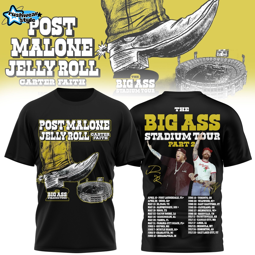 Don’t miss out on this essential piece; grab your Post Malone & Jelly Roll The Big Ass Stadium Tour Part 2 for 2026 Tshirt today at RushWearStyle!